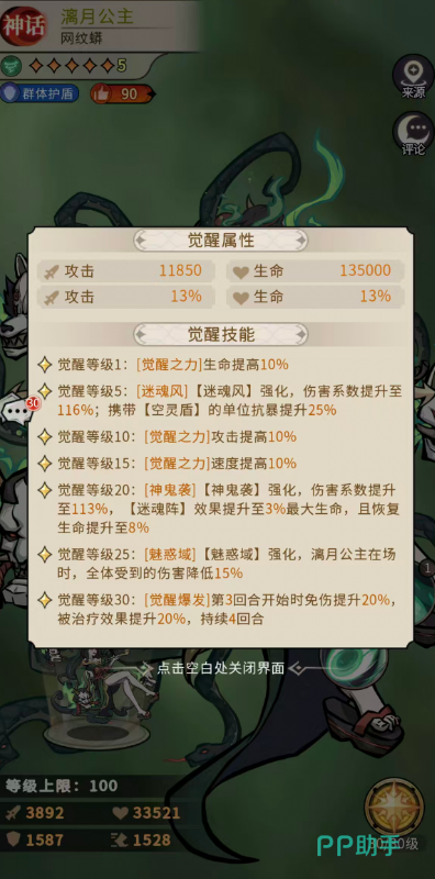 觉醒系统进一步释放漓月公主的辅助潜能:觉醒等级1级时,“觉醒之力”提供的生命加成提升10%;达5级后,“迷魂风”自动进入强化状态(伤害116%,空灵盾抗暴+25%);10级时攻击提升10%;15级时觉醒之力生效速度加快10%;20级时“神鬼袭”完成强化(伤害113%,迷魂阵额外损血3%,回复8%);30级终极觉醒开启爆发模式——自第3回合起,漓月公主自身免伤提升20%,并额外获得20%治疗效果增强。