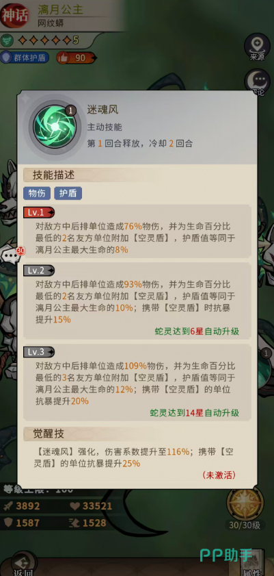 主动技能“迷魂风”具备双重功能:一方面对敌方中后排单位造成76%物理伤害;另一方面为当前生命百分比最低的两名友方角色施加“空灵盾”,护盾值等于漓月公主最大生命的8%。该机制高度依赖其自身生命上限——队伍中配置能提升生命属性的角色,将直接放大护盾收益。当漓月公主升至14星时,携带空灵盾的单位额外获得20%抗暴率加成;技能强化后,伤害系数提升至116%,同时空灵盾持有者的抗暴率进一步增至25%。