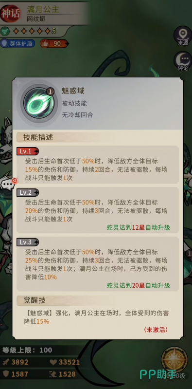 被动技“网纹蟒体质”提供稳定基础增幅:永久提升20%生命与10%攻击。而终极被动“魅惑域”则在实战中发挥关键控场作用——当漓月公主生命首次跌破50%时自动触发,使敌方全体在接下来2回合内防御与免伤均降低15%,且效果不可驱散,每场战斗仅限触发一次。升星后,只要她在场,全队所受伤害降低10%;该被动强化后,全队减伤效果提升至15%。