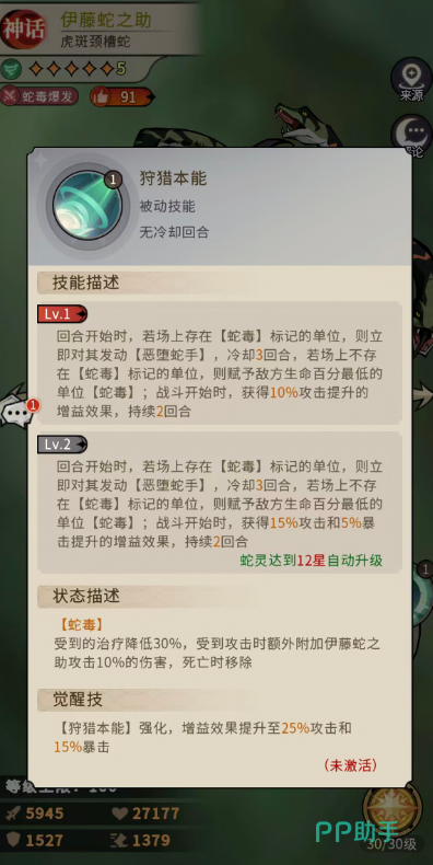 核心被动“狩猎本能”决定整套阵容运转节奏:回合开始时,若场上存在蛇毒标记,则立即对任一带毒目标施放一次“恶堕蛇手”,冷却3回合;若无毒目标,则自动对敌方生命比例最低者施加1层蛇毒。该效果在战斗首回合即触发10%攻击力增益。技能强化后,增益升级为25%攻击力与15%暴击率,显著提升挂毒稳定性与频率。