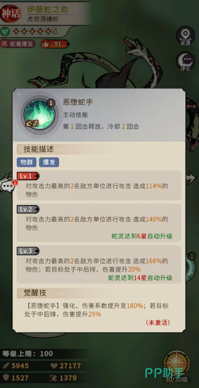伊藤蛇之助的核心输出逻辑分为三重维度:高频群攻压制、斩杀补刀强化、以及被动毒效驱动。其普攻衍生技“恶堕蛇手”为物理范围攻击,基础造成114%攻击力的伤害,作用于敌方攻击力最高的两名单位;当目标位于中后排时,伤害额外提升20%;技能强化后,基础系数升至180%,觉醒状态下对中后排目标再增伤25%。