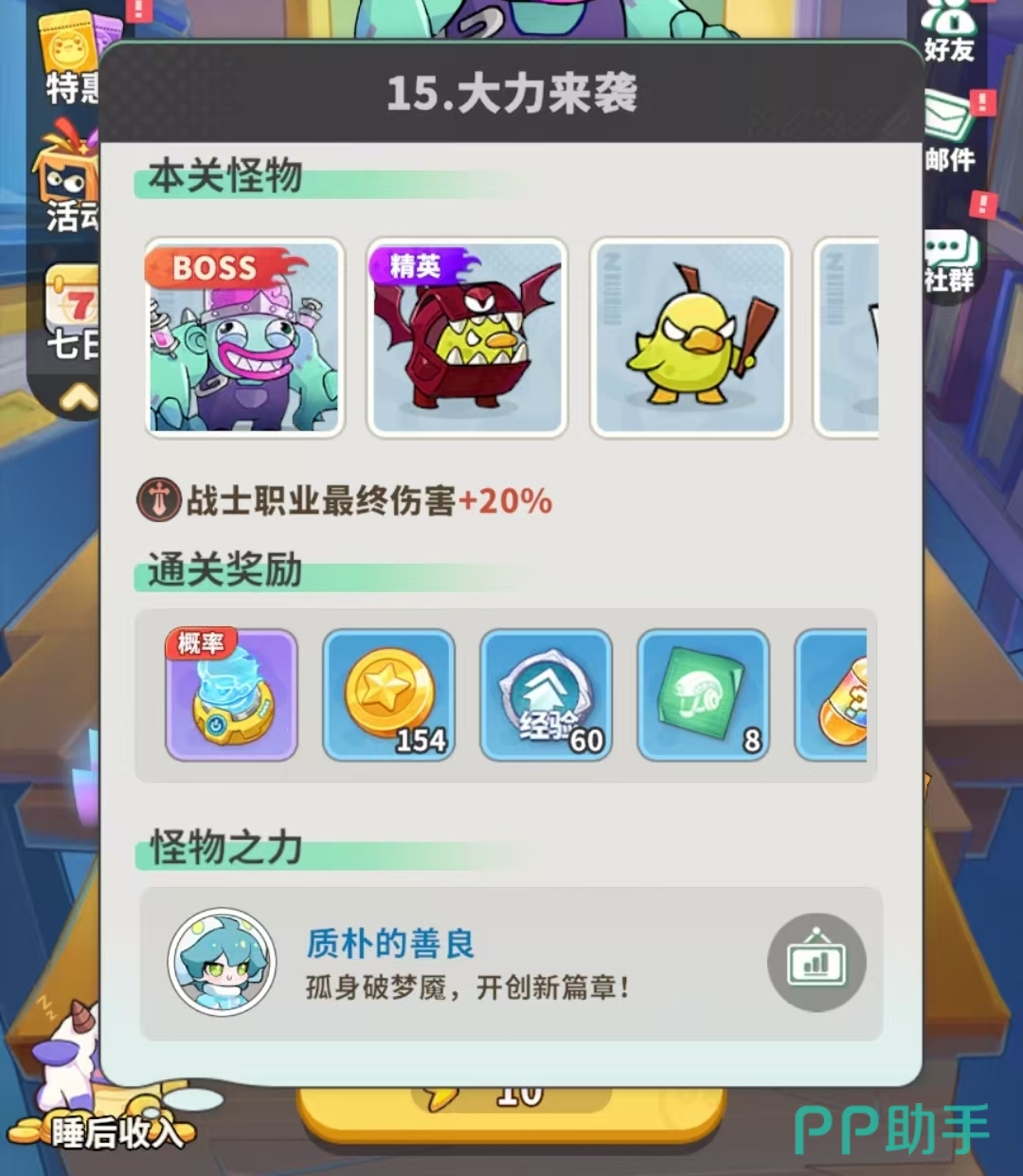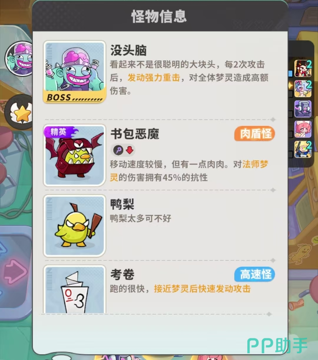 梦境护卫队第15关属于中高难度过渡节点,虽无复杂机制限制,但敌方配置对队伍构成与角色练度提出明确要求。本关核心挑战来自两类单位:Boss“没头脑”与精英怪“书包恶魔”。前者具备群体高额伤害技能,会在完成两次普攻后立即释放全屏打击;后者则在战斗中段入场,持续向防线推进,拥有较高基础生命值及针对法师职业梦灵的专项抗性加成,显著削弱法师类输出效率。