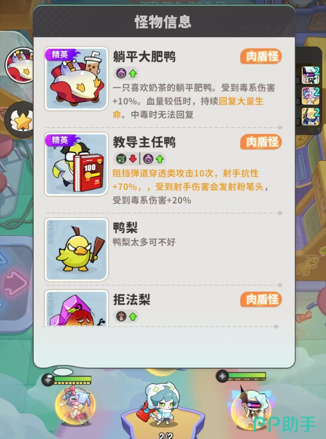 本章存在两个机制型精英怪:中段遭遇的“教导主任鸭”与关底Boss“躺平大肥鸭”。前者具备10次穿透攻击格挡能力,并拥有70%射手抗性,大幅削弱弓箭类输出效率;同时受射手伤害后会触发粉笔头反击,形成持续威胁。后者虽无复杂反制手段,但其低血量阶段的生命恢复效果,极易打断爆发节奏,延长战斗时间,增加容错压力。值得注意的是,该回血机制存在明确克制条件——当“躺平大肥鸭”受到毒素伤害时,回血效果将被完全禁用。此外,毒系攻击对其及“教导主任鸭”均能造成额外伤害加成,构成本章最高效的破局路径。