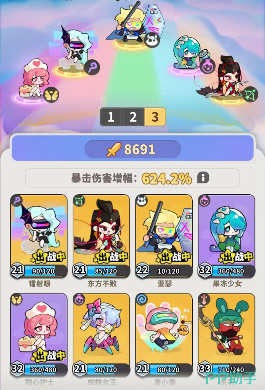 该组合以高覆盖率AOE与持续压制能力见长。镭射眼的直线激光具备反弹特性,在获得“弹射”“延长”等强化后,可在屏幕内形成多段折射伤害链,有效封锁怪物行进路线;东方不败则凭借高穿透飞针,兼顾清杂与点杀,搭配“爆炸”词条可显著提升范围溅射伤害。前排选用亚瑟承担承伤与嘲讽职能,甜心护士提供稳定群体治疗与减伤支援,果冻少女补充持续毒伤或施加减速/禁疗等软控效果,整体容错率高、应对场景广。