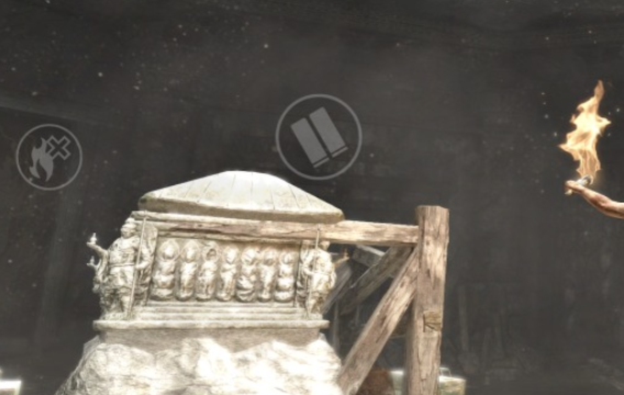 拾取宝物后绕至瀑布后方,即可发现古墓入口。进入后需使用斧具辅助攀爬垂直岩壁,登顶后点燃火把激活机关。沿通道前进抵达营地,定位名为“劣民之坟”的目标地点。此处分布多具遗骸及两座铁笼,需推动右侧铁笼使其坠落,从而触发左侧金属平台上升机制。
