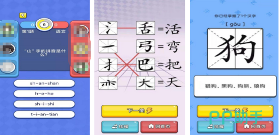 精心设计的关卡内容有不同的玩法。可以选择单人闯关,也可参与多人对战,就比如在对战模式里,每个关卡中都会给出随机的题目。就比如生字的拼音是什么,那么下方就会呈现出不同的拼音组合方式,大家可呃根据自己所学的知识选择到正确的答案,看看在规定的时间之内,哪方获得的分数最高。甚至在游戏中还会看到狗这样的单个汉字,下方也会看到多个组词等。