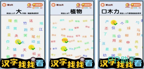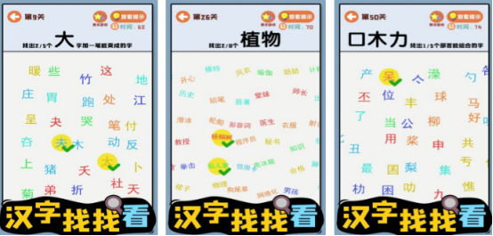 将汉字文化以及找茬元素巧妙结合。每个关卡都有具体的任务要求,还有极具挑战性的题目呈现出来,就比如有的的关卡,需要让大家在不同的汉字当中,寻找到8个是植物的汉字或者是词语,这些汉字词语都有不同的意义,只要选择到植物就可以顺利完成挑战,不过每个关卡都有规定的时间,遇到难以突破的难关时也可查看提示。