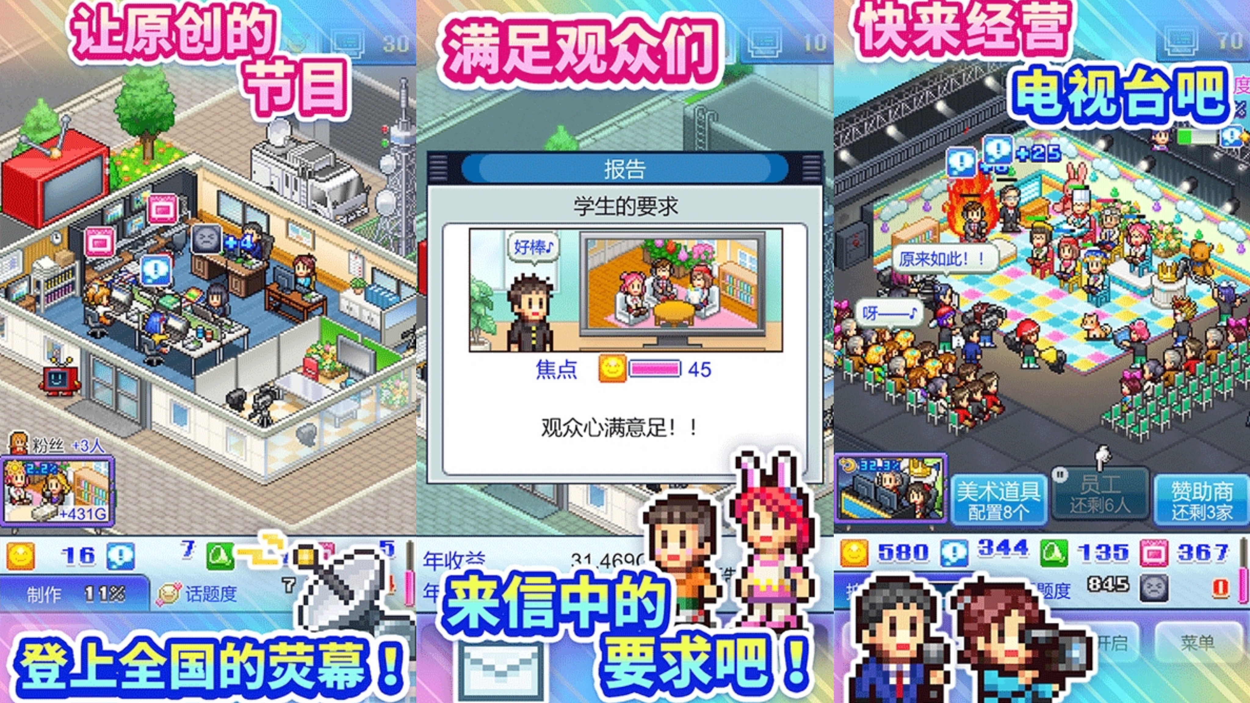 这是一款以电视节目制作为主题的模拟经营手游,我们的游戏目标就是打造最受观众喜爱的王牌电视节目。我们需要从节目策划,现场布置以及嘉宾邀请等各个环节开始打磨,同时还需要不断挖掘新的节目类型,紧跟市场风向,增加观众对于节目的满意度。另外我们要根据不同的节目来调整出席嘉宾和主持人,这也是提升观众喜爱度的重要因素哦!