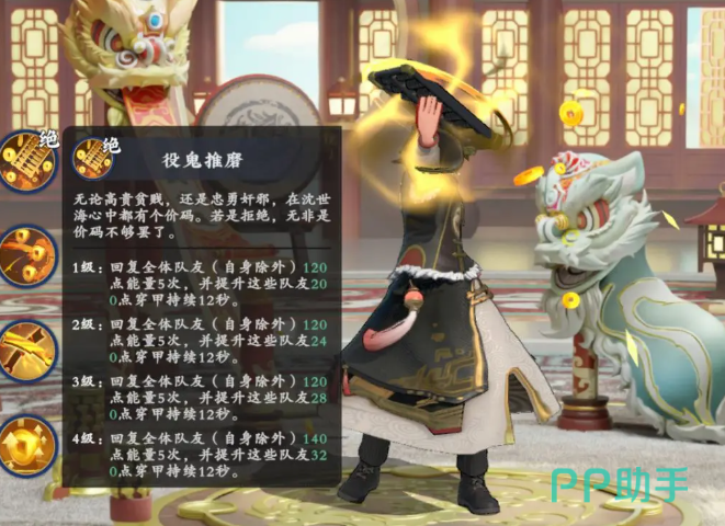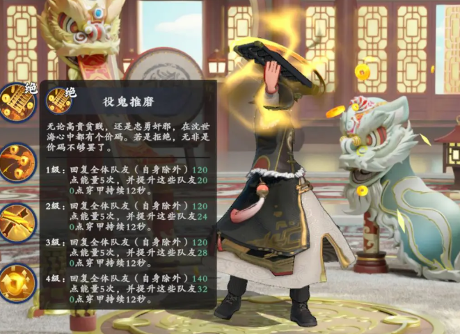 兼具团队防护与战术续航能力的支援型武者。核心技能“破阵乐”可为全体友方单位施加护盾,护盾值相当于施放者1100%攻击力,持续7.5秒,期间每1.5秒衰减20%,形成稳定缓冲区间,显著提升队伍整体容错率与前中期抗压能力。