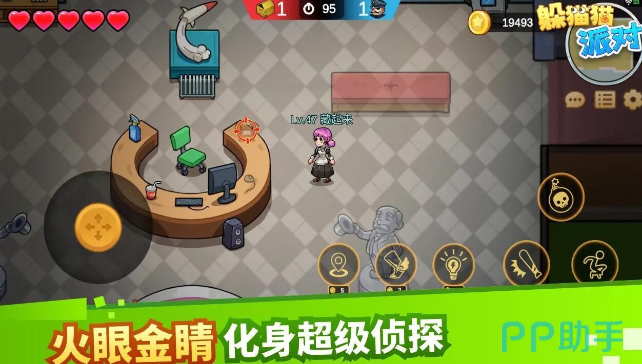 《躲猫猫派对》采用的是5v15的非对称性模式,分为躲藏者和寻找者两大阵营,各自阵营的玩家需要按照身份来进行游戏。对于躲藏者来说,可以化身为花瓶和书本等各种事物完美融入环境。而搜寻者的目的就是使用探测仪等特殊装备来找出躲藏者。游戏中为两个阵营提供了数十种可以使用的特色道具,且部分地图还会因环境影响而增加难度,喜欢捉迷藏的玩家可以尝试。