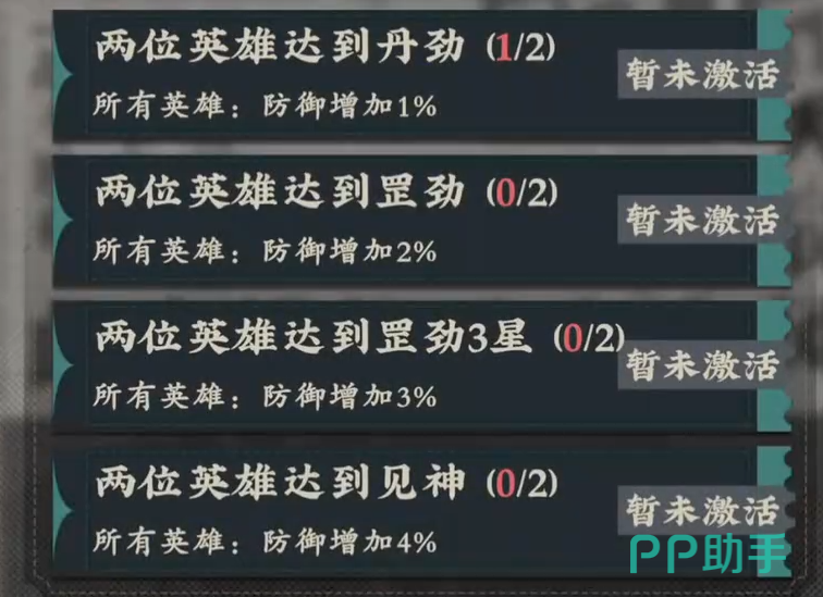以“风云之余”组合为例,当其中任意角色达到丹劲境界时,全队即获得1%防御力加成——该效果无需全员上阵,仅需至少一名成员处于出战阵容中即可生效。若进一步将角色培养至罡劲境界,基础防御加成将随之提升,形成阶梯式增益。