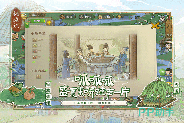 取材自陶渊明《桃花源记》,构建封闭式生存发展模型。玩家带领初始村民从零起步,在山水环绕之地采集木材、石料、草药、矿砂等基础资源,逐步搭建房屋、粮仓、冶炼炉、织机等设施。人口增长与劳动分配直接影响村落扩张节奏,食物储备、健康值、士气值构成三大核心生存指标,需平衡采集、建造、医疗与教育投入。
