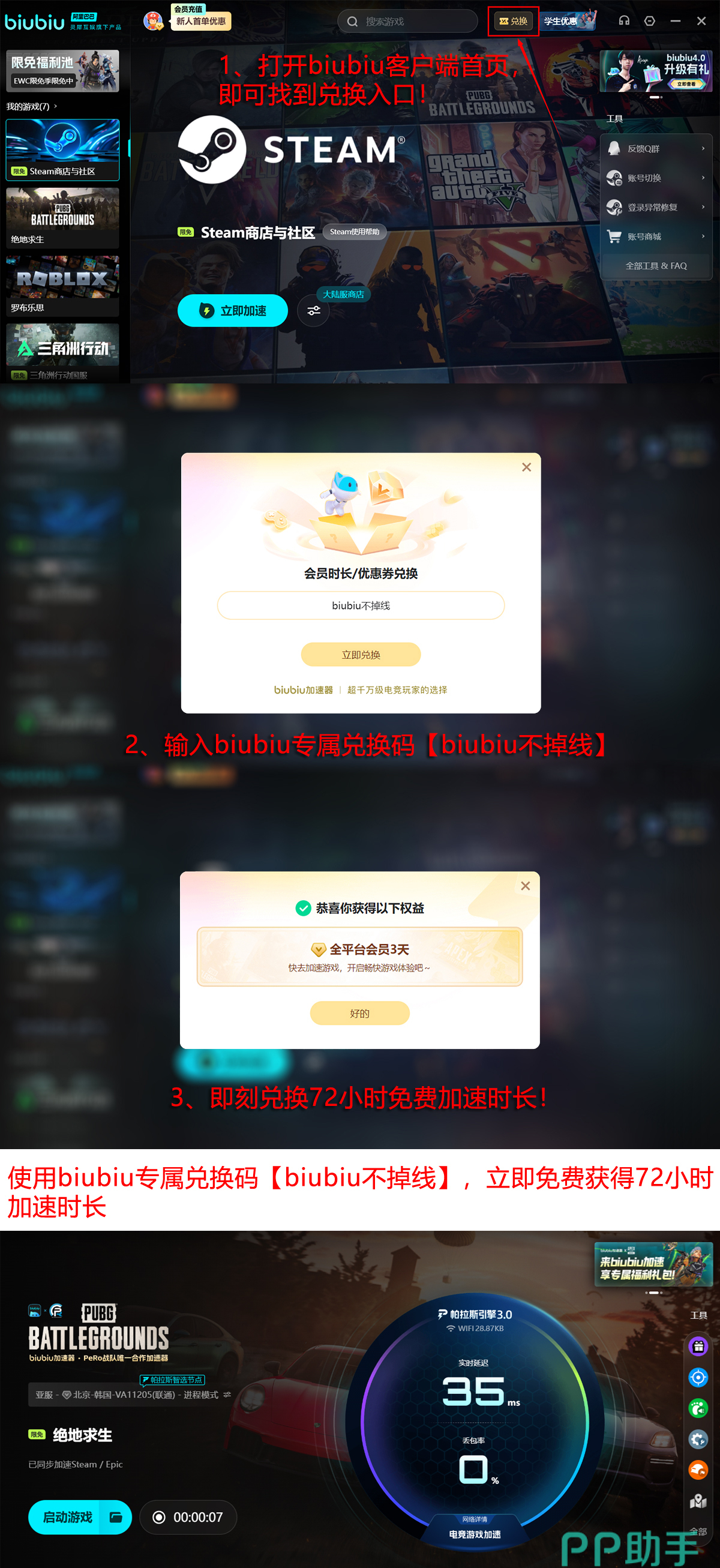 另外,新号注册完会直接白送24小时免费时间。接着去软件里的“兑换”或“福利中心”,输入【biubiu不掉线】,还能多兑三天。里外里一算,就能不付费用上96小时。