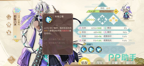 2技能附骨之毒,效果是小刀粹上毒药,每次攻击有60%的几率使目标的负面状态增加1回合。升级之后增加状态触发的几率,等级2的时候几率增加10%,等级3几率再增加10%,满级时状态触发几率高达80%,配合1技能的普攻,可以说是在毒队里面非常恐怖的一个技能。并且不仅仅是毒队,像是眩晕沉默等负面状态也都是可以被这个技能延长持续时间,是一个非常具有战略价值的技能。