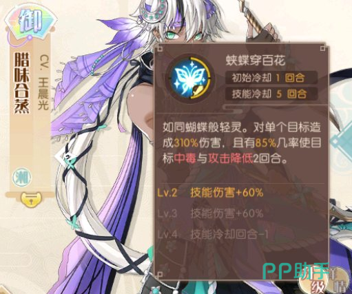 3技能,也就是腊味合蒸的终极技能叫做【蝴蝶穿百花】,如同蝴蝶般轻灵,突进对单个敌人造成310%的伤害,并且有85%的几率使敌人陷入中毒和攻击下降2回合的负面效果。升级之后增加技能伤害,等级2的时候技能伤害增加60%,等级3的时候技能伤害增加65%,等级4的时候技能冷却减少1回合。
