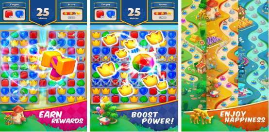 清新靓丽的游戏画风,将让大家感受特别爽快的消除体验感,不同图案的棋子错综复杂的摆放在那里,通过合理滑动的方式只要确保相同的三个棋子连在一起,即可消除或者是合成,每次在消除之后还可以获得相应的分数,屏幕的左上角会看到具体的任务要求,比如需要寻找到50个红色图案或者是蓝色图案等等。