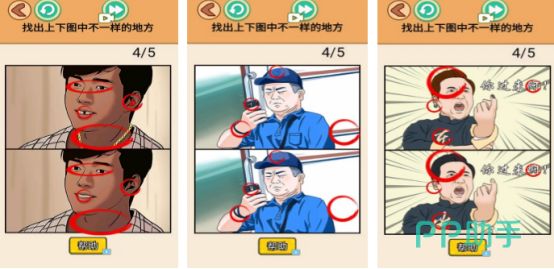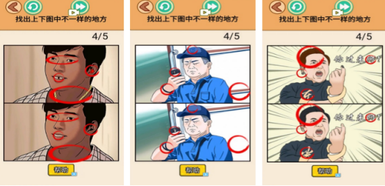 经久不衰的找茬为最基础的蓝本,用自己的火眼金睛寻找到屏幕当中不对劲的地方,关卡开始后会在屏幕上下方呈现出两张极度相似的图片,比如看似这两张人物极为相似,但是也会隐藏眼睛或者是牙齿上的差异,大家只要在规定的时间之内从上下图中找出不一样的地方就算完成。