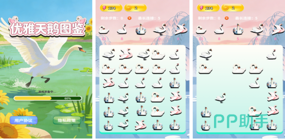 各种翩翩起舞的天鹅应有尽有,将优雅的姿态呈现的淋漓尽致,基于三消连线为核心,各种可爱的天鹅或者各种灵动的瞬间。在开局后,屏幕上将会呈现出不同样子的天鹅,而大家却需合理规划,用连线的方式将这些相同的天鹅连接在一起,即可快速消除,屏幕最上方将会看到具体的指示,比如剩余的步数或者是最长的连接数量等等,按照具体要求完成连线消除任务。