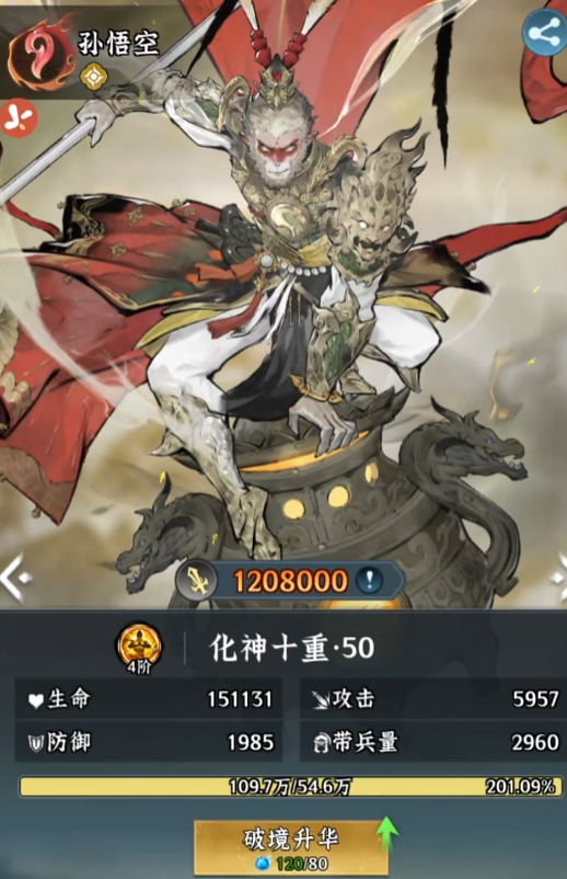 该角色定位为红色传说品质,是当前版本中稀有度与综合战力双顶尖的存在。其基础属性全面偏向进攻端,主属性为高攻击与高暴击,契合快节奏强输出的战斗风格。角色形象设计融合古典神韵与现代视觉张力:身披玄甲战铠,赤焰披风猎猎飞扬,尽显大圣威仪。完成培养后,可达成三星星级,满配状态下总战力突破百万大关。