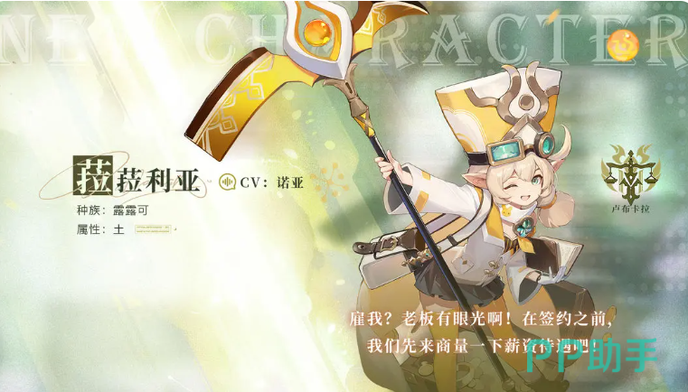 菈菈利亚为露露可种族,隶属卢布卡拉势力。尽管实际年龄为26岁,但外观呈现幼态化特征,属游戏中唯一已实装的露露可角色。定位为远程辅助,技能设计强调中远距离功能性支援,包括但不限于元素覆盖、状态协同与战术牵制。其土属性技能组在团队协作场景下可提供稳定的地形控制与抗打断增益,契合多角色联动体系。