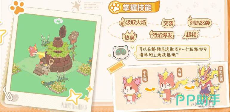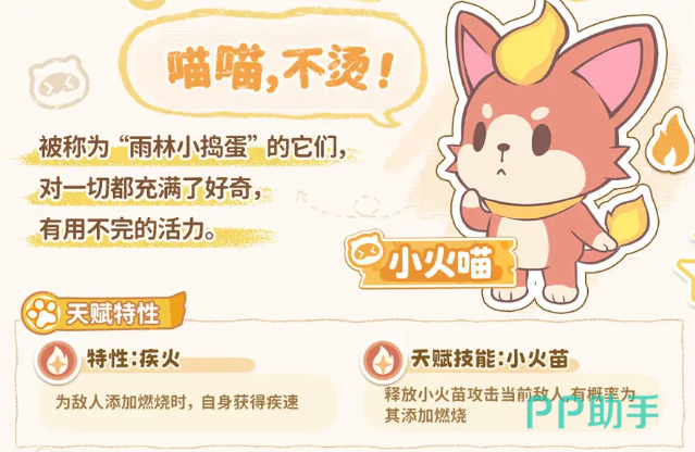 小火喵作为火系入门主力,拥有双重机制支撑:其特性可触发持续燃烧伤害,并同步赋予自身疾速移动效果,实现边位移边输出;天赋技能“小火苗”则在每次攻击时附加可叠加的灼烧状态。该角色具备清晰的三阶进化链:小火喵 → 火喵 → 双刃炎猫,最终形态下,“烈焰怒袭”技能将获得爆发强化,显著提升单位时间内的瞬时输出能力。