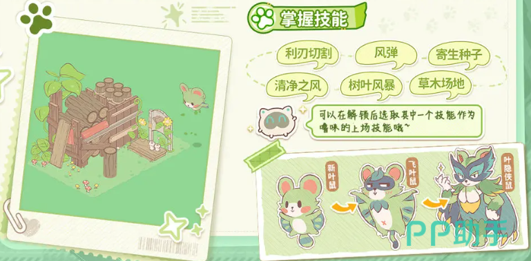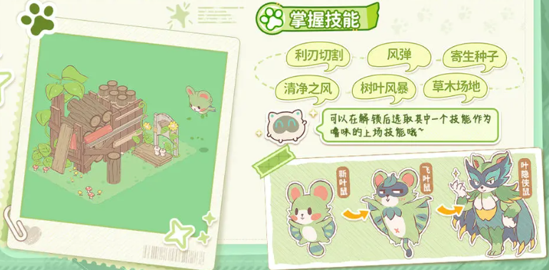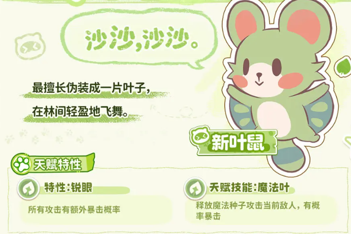 新叶鼠是风系体系中的暴击特化型角色。其特性“锐眼”直接提升所有攻击动作的暴击触发概率;天赋技能“魔法叶”在释放种子攻击时,额外附加暴击判定,形成双层暴击增益。二者叠加后,整体暴击覆盖率远超常规风系单位。后期技能组涵盖利刃切割、风弹射击、寄生种子及树叶风暴等,兼顾单体穿透与群体压制。进化路径明确分为三阶段:新叶鼠 → 飞叶鼠 → 隐身侠鼠,终阶形态解锁更高阶的机动性与隐匿打击能力。