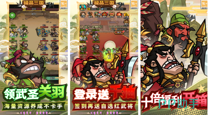 极品三国是个拥有卡牌放置和回合玩法的精品佳作,海量资源登录就送可以轻松培养帅气的武将,一千连抽的新手福利可获得的资源更是拿到手软,比较抽象的三国武将造型刻画也令大家过目不忘,开箱抽盲盒的系统加持与卡牌元素交相呼应,个性化的抽卡强化机制带来的沉浸感也比较硬核,全新杜撰了古代的历史故事和战役的走向,精彩绝伦的内容呈现也带来不错的新鲜感。