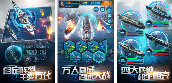 王牌战舰其实是款加入了策略战争和战棋模式的神作,四大兵种的加持也实现了相生相克,能随心所欲选择战舰并设定阵型参与海战,满屏幕都是战舰的战斗画面塑造更加深刻,千变万化的阵型搭建也为这款海战手游润色不少,百团大战的震撼海战景象就有如CG电影一般,海战类手游粉丝可尽情选择不同战舰参加战斗。