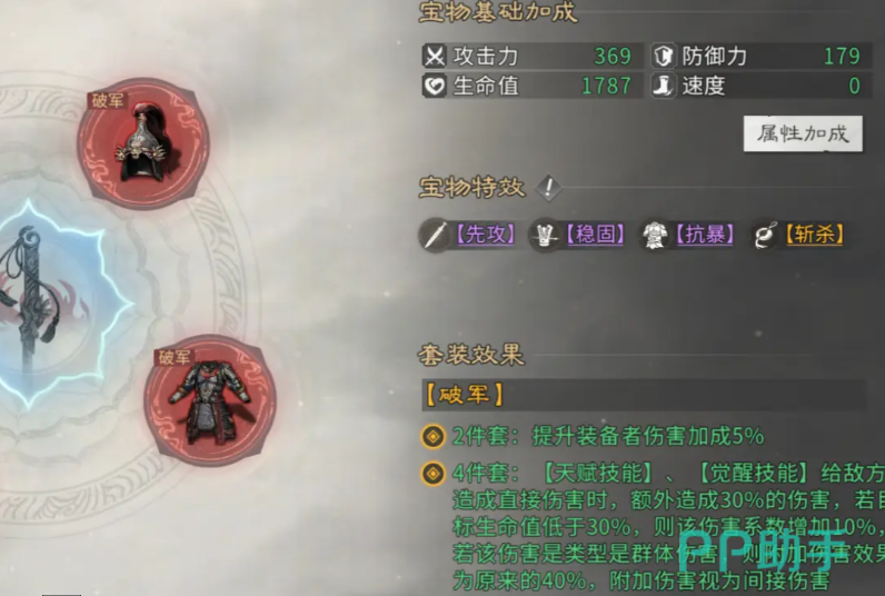 觉醒优先级上,务必选择优先吕布。吕布在觉醒之后,单体伤害就可以大幅度的强化,能迅速的实现敌方减员,让队伍的收割节奏提前,在对局的过程中具有决定性的作用。宝物的选择是这一套阵容的关键,吕布核心是推荐破军4件套,这一个套装两件套就能迅速的提升5%的伤害加成,额外还会有30%的伤害。目标生命值如果低于30%还会额外的增加10%,这简直就是给斩杀能力去量身定制。附加属性还是要重点的堆暴击率,还有穿透率,把爆发潜力全部的提升。