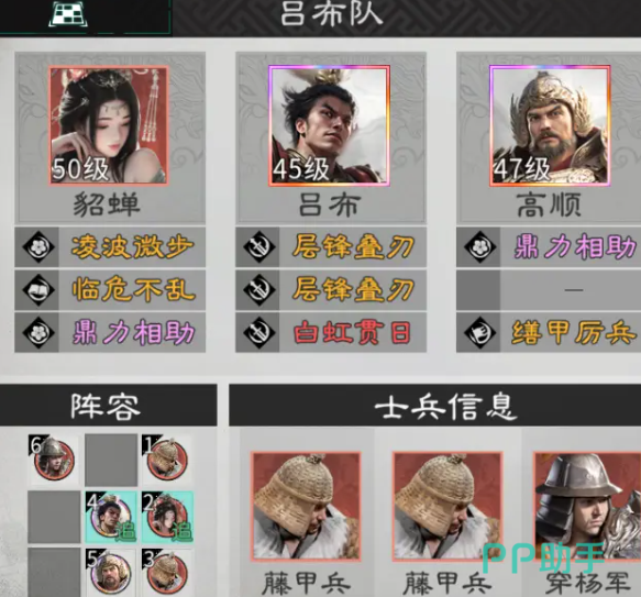 在核心成员的选择上,吕布就是核心的输出,貂蝉还有高顺则是关键的辅助。高顺靠着高于所有敌军的统帅辅助,貂蝉则需要保持魅力属性,才能碾压对方。这就要求给两位辅助搭配能够迅速提升对应属性的优质宝物,才可以拥有更稳定的优势。兵种搭配方面,建议选择两个藤甲兵加一个穿杨军,藤甲兵就能迅速的提升防御的韧性。穿杨军就可以增强输出穿透,让吕布的伤害更有威胁。在技能携带方面,吕布可以选择白虹贯日,最大化单体爆发以及追击伤害。