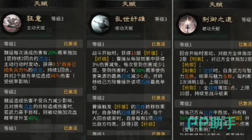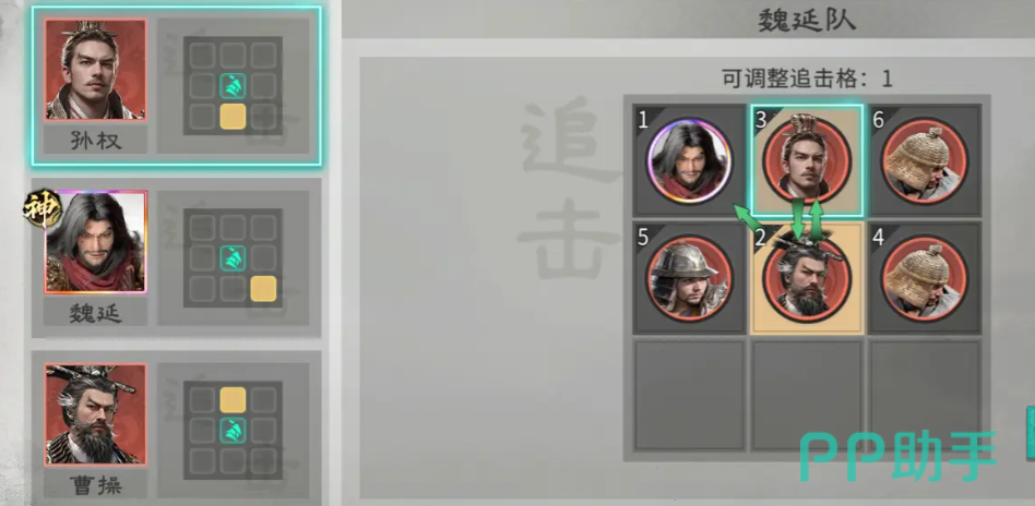 阵容采用前排双藤甲兵+后排单穿杨军的经典布阵。前排承担承伤职能,藤甲兵提供基础减伤与火抗冗余;杨军作为物理穿透型输出单位,可有效补足爆发缺口。英雄站位需严格遵循追击格联动规则:魏延不占用追击格,而曹操必须同时位于魏延与孙权的追击格交汇点上,以最大化触发协同效果。三名核心武将均需完成升阶操作,方可激活追击格功能。魏延的核心天赋“狂意”为全队输出基石——1级即生效,主动行动时可对两名敌方目标造成66%武力伤害;曹操天赋“乱世奸雄”提供开局10层护盾,实现30%常驻减伤;孙权天赋则在战斗开始时,为敌方施加2层“制衡”,同时为己方叠加2层“统御”状态。