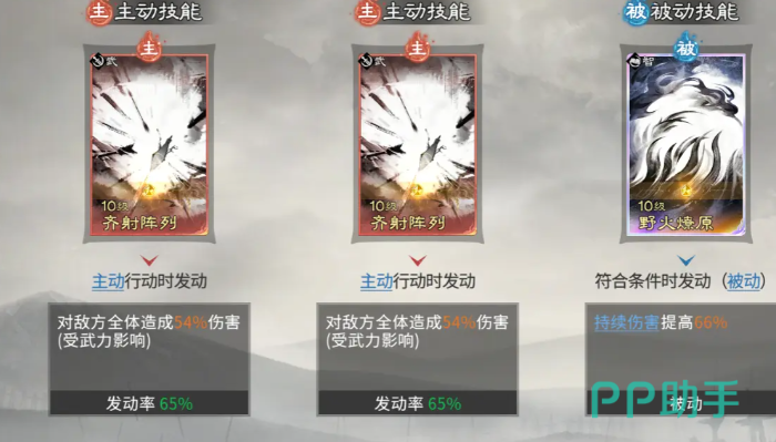 技能搭配方面,魏延主选主动技“齐射阵列”,65%发动率可对敌方全体造成54%武力伤害,并配合被动技“野火燎原”——该技能提升66%持续伤害,使流血效果实际倍率翻倍;曹操推荐携带“一夫当关”,72%概率降低自身14%所受伤害,引导敌方集火目标,间接保障孙权安全输出环境;孙权则选用“惑心挫志”,67.5%概率对三名敌方造成60%魅力伤害,并有20%概率附加持续两回合的25%虚弱效果。