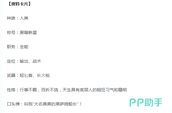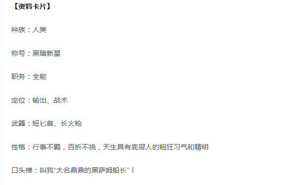 黑萨姆的逆袭故事又被称之为小人物的逆袭,虽然出身于底层,但是却不会甘心于命运的安排。四处游荡,去寻找改变人生的机会。在一次意外下收获几枚金币,成为了他航海生涯的起点,他用这笔钱雇佣了水手,然后在海上自由的驰骋。作为游戏中第1个亮相的英雄,他的定位可以说真的很全能,有输出,有战术,武器的搭配也是很有特色的。短匕首负责近距离的突袭,长火枪就能有效负责远程输出,把两者搭配在一起,就能适合于不一样的战场。