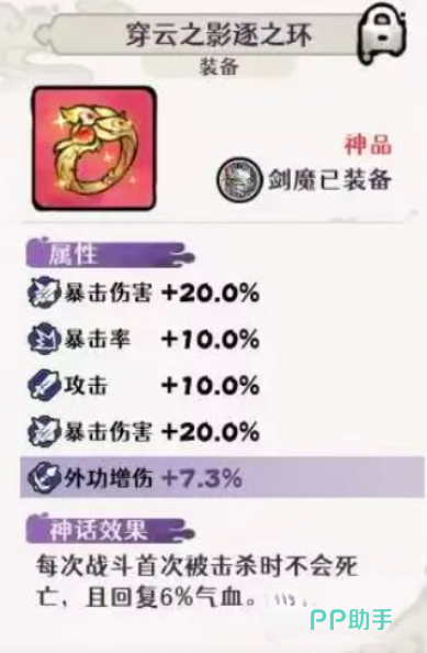 第二个装备是影逐之环,该神装适合于全职业,不仅能够提供20%的暴击伤害,10%的暴击率。而且在外公增伤上还可增加7.3%。攻击可增加10%。它他的特殊机制是在单次作战,被首杀后不会真正死亡,在原地可自动复活并复恢复6%的最大气血,可以有效降低操作失误问题,新手过渡期的保命神装。