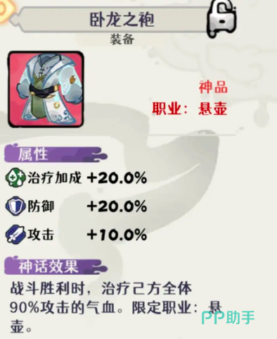 最后一个强推的开荒装备——卧龙之袍,悬壶职业角色的专属神装,不仅可以提供20%的治疗加成,防御值还可提升20%,攻击效果也可提升10%,玩家在战斗胜利之后,可将全体己方单位恢复90%攻击的气血值,可以帮助整个团队在多回合制战斗中提高续航能力,以及重复挑战的获胜率,常常是开荒和日常资源积累的理想选择装备。