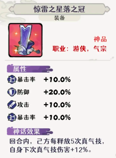 排行榜上荣登第三位的是星落之冠,是气宗和游侠的限定头部配饰可提供10%的暴击率,20%的防御值和10%的攻击,而高装备的核心机制是在每一个回合内,如果己方每次放5次蒸汽剂,如果己方每次放5次真气技,自身下次真气技伤害增加12%,因此对于很多真气技能使用频率较高的角色可以绑定该装置,尤其是游侠辅助流派和气宗主C。