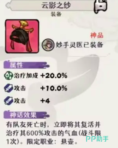 第一个装备是云影之纱,是一个高颜值的头部装饰品,作为悬浮职业当中的限定神话级装备,不仅可以为角色提供20%的治疗,加成10%的额外攻击属性,还可以增加4点攻击效果,无论是在输出还是回血上,都有着非常不错的表现。当玩家解锁主动技能后,己方队友死亡则可立即复活,且适用于任何队友之中,并且可恢复队友600%的攻击值气血,在高难度副本和pvp战斗中是必选的关键装备。