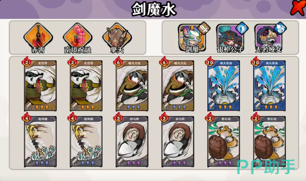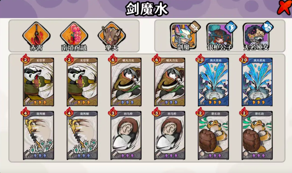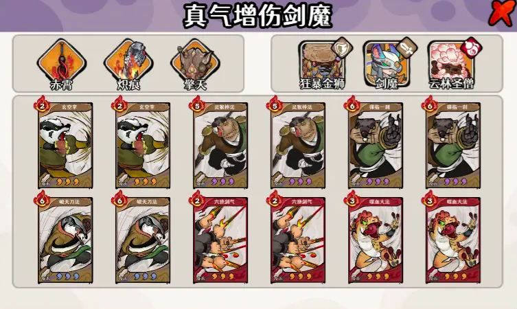 第二组是真气增伤流,不过这一组的整体造价会偏高,神兵方面依旧是晴天为优先最高级。其次是赤霄和赤痕,在武侠搭配上可将玉兔换做云林圣僧,但必要条件是云林圣僧达到2命;卡组的话依旧沿用剑魔的8张老组合模式,再搭配4张攻击为主的灼烧型卡牌。
