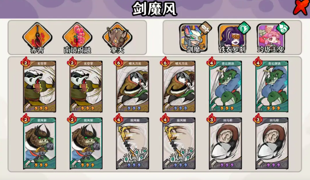 第一组是小编强推的通用模式——剑魔土土风,在神兵的选择上,擎天是玩家必带的。其次是赤霄,第三个可选择南境祝融。如果手中会抽未抽出祝融神兵,可换做绝情(如果这两个神兵都没有选择回怒,神兵也可以);在英雄选择上除建模外,可搭配土属性豪侠金狮和木属性玄狐玉兔,而在卡组选择上的话,幻境四商店的烈风展为首选,如果没有裂风斩可替换成独行刀法。