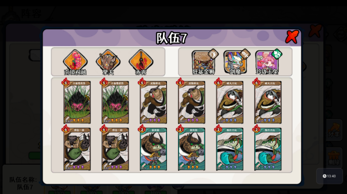 核心阵容为:剑魔(主C)+ 玉兔(治疗/复活)+ 狂暴金狮(破防/控场)。装备体系需严格匹配角色职能:主武器选用赤霄,副武器为擎天,特殊装备配置南境祝融,三者协同强化风系与图系武学联动效率。