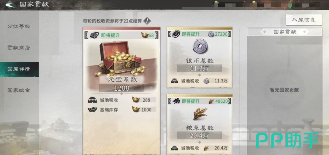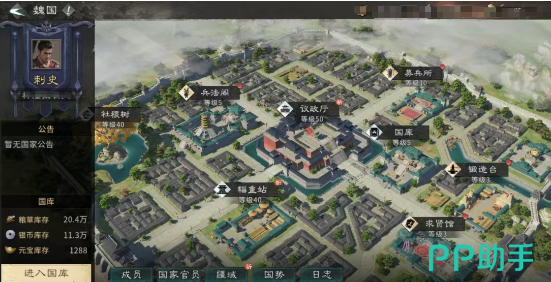 魏国为新入玩家提供了扎实的起步基础。进入国库可见:粮草存量20.4万,元宝1288,银币11.3万。该数值为游戏初始状态实测所得,非临时活动加成,可直接支撑前期征兵、装备制造及日常消耗,大幅降低资源断档风险。建筑方面,议政厅已达50级——作为国家核心,其等级直接影响资源产量加成;社稷树与辎重站同步升至40级,分别强化资源产出效率与物资运输能力。三项关键设施均处于高位,意味着玩家无需耗费大量时间从零建设,即可获得持续稳定的后勤保障。