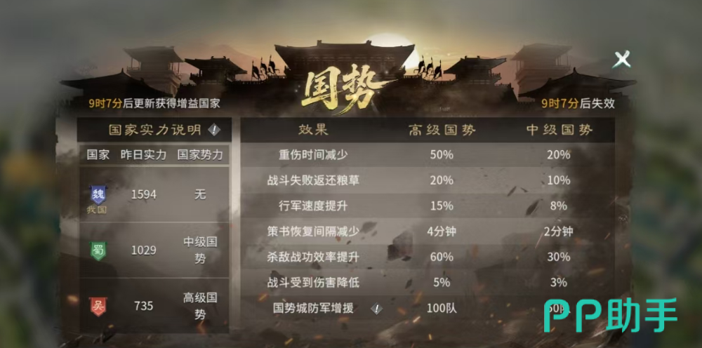 当前魏国虽尚未激活国势效果,但昨日综合战力已达1594,在魏、蜀、吴三方中位列第一。国势将在9小时后刷新,届时将解锁最高阶增益。该状态生效后,部队重伤恢复时间缩短50%,战败时返还20%粮草,显著降低战斗损耗;同时行军速度提升15%,在资源点抢占、商路调度等高频操作中具备明显先手优势;每日可执行多次资源采集指令,守城响应效率高,应对突发攻城压力更从容。