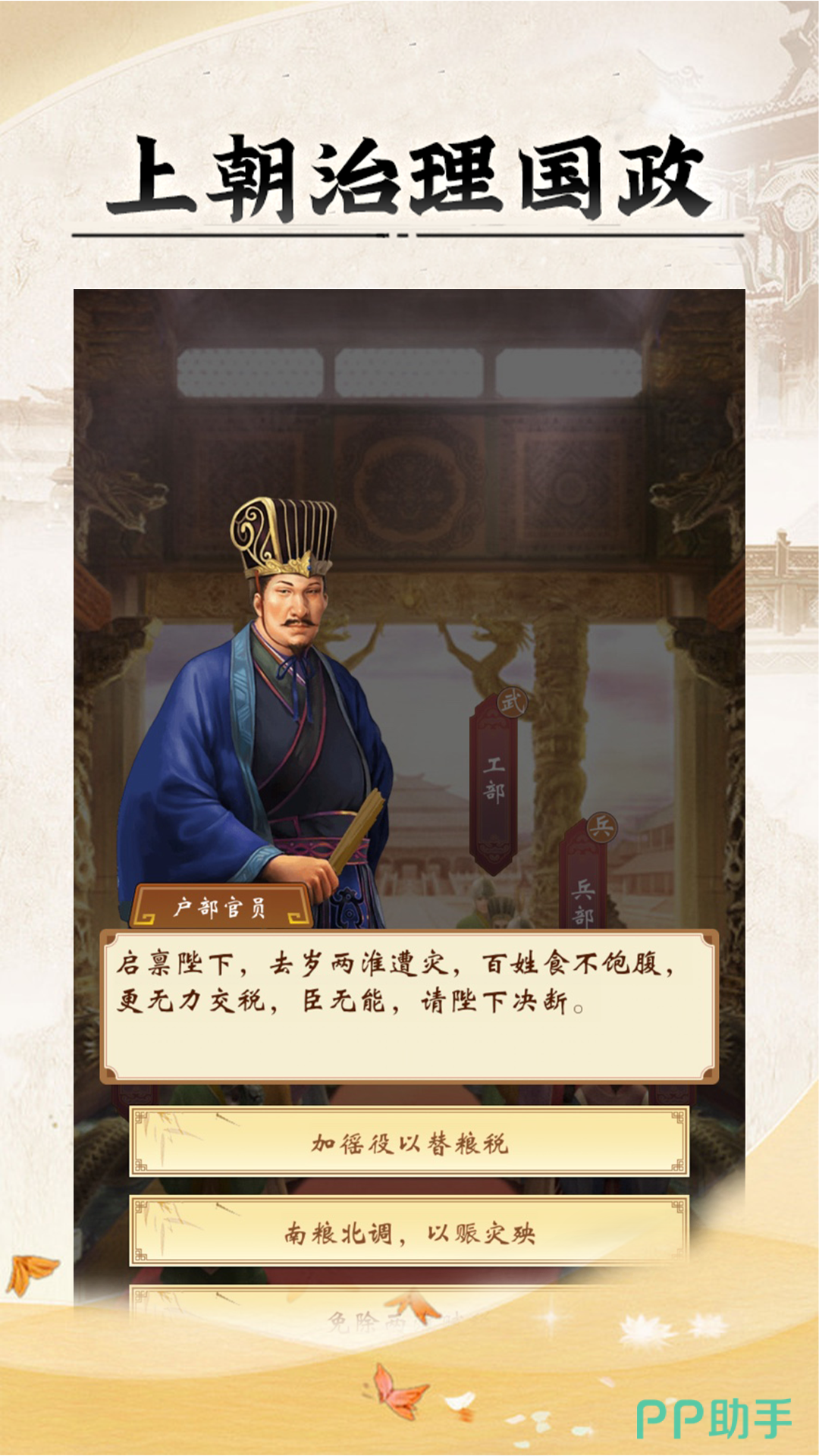 古风模拟经营类代表作,以帝王视角统御王朝全局。玩家需统筹内政(科举、赋税、水利)、军事(征兵、布防、远征)、外交(和亲、朝贡、宣战)及后宫管理(子嗣、宠幸、权谋)等多维系统。所有决策实时影响国运数值与朝臣态度,触发连锁事件与隐藏剧情。美术风格还原明代宫廷意象,UI界面采用仿古卷轴设计,细节处体现传统礼制与历史质感。完全离线运行,支持长周期养成与阶段性目标达成。