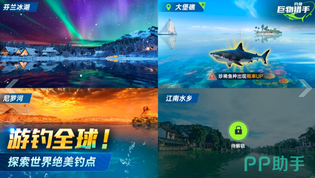 本作无体力限制机制,玩家可随时开启垂钓。全图开放超百个地理特征鲜明的钓点,覆盖全球真实海域设定;鱼类图鉴收录逾三百种可收集目标,涵盖常见淡水种至濒危深海巨物。PVP钓鱼比拼玩法同步开放,支持跨服实时竞速,优胜者除获得专属外观外,还可赢取限定鱼竿强化材料及稀有鱼卵。
