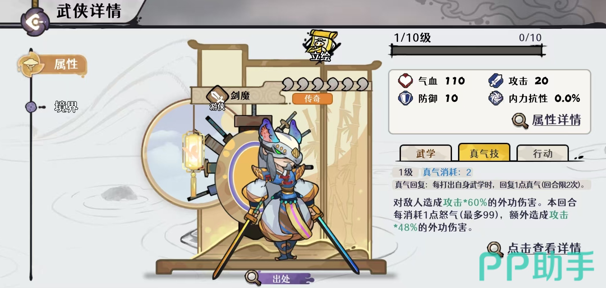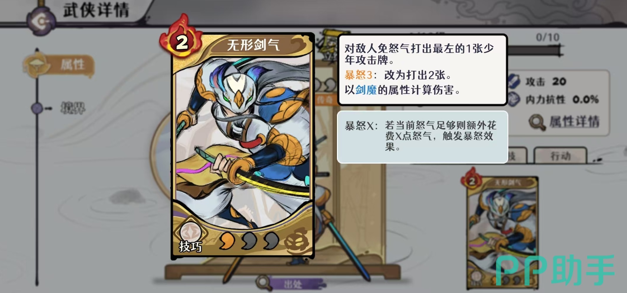 剑魔的核心定位为外功系绝对主C,兼具高下限与强单点压制力。其真气技可造成基础外功伤害,并在本回合内每消耗1点怒气,额外追加一次外功伤害;武学“无形剑气”默认打出最左侧一张少年攻击牌,若触发暴怒效果,则改为连续打出两张。该机制使其天然适配高频出牌、怒气滚动类体系,是当前环境中少有的“一拖二”能力突出的单核型角色。