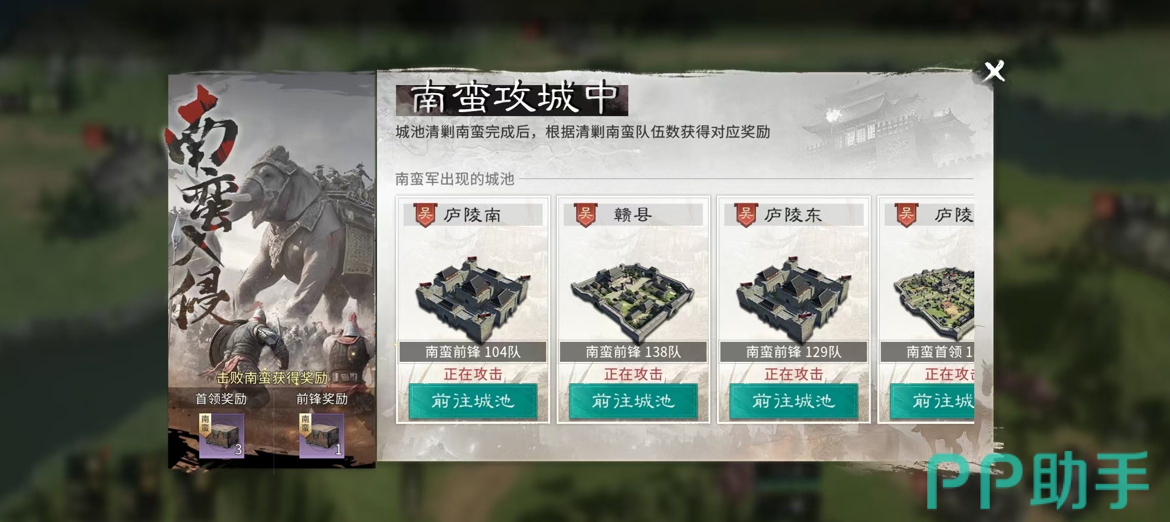 本活动为单服独立运营机制,不涉及跨服务器交互。每日共开放三轮:12:30至14:59、17:30至19:59、21:30至23:59。活动期间,玩家可在主界面直接点击“南蛮入侵”图标进入,或通过活动面板快捷跳转。活动地图上清晰标注所有被南蛮占据的城池,玩家可根据自身主城与目标城池间的距离远近,自主选择清剿优先级。战斗目标分为两类——前锋部队与首领单位,二者均提供对应奖励,且奖励按成功击败的部队数量累计发放。