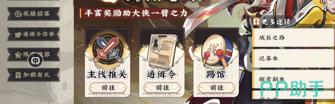 侠盗界面右下角揭榜即将开始,通缉令任务的完成,在挑战时拥有时间的限制,挑战每一个敌人都需要在系统规定的时间内完成,如果武师的战斗力不足,很有可能导致通缉任务的失败,所以最关键的还是阵容中好友之间的协作机制,在通缉令任务中,玩家对同一通缉令拥有三次帮助的机会,在战力不足或者是经验缺少的情况下,可以邀请好友以互助的方式拿下敌人。通缉令任务中也设置了最终的绝杀奖励,意思就是说最终将目标敌人击败的那一位玩家将会获得相应的奖励,但是小编还是建议把绝杀奖励优先留给最主要的输出选手,以便后续的任务完成顺利。
