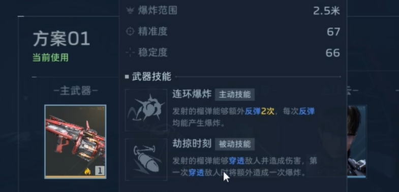 先看看基础数据,单发伤害149,射速92,弹夹容量13发,总弹量72发,爆炸范围2.5米。精准度67,稳定度66,这个数值说实话不算特别出众,但配合上它的技能之后,伤害输出能力就完全不一样了。主动技能叫连环爆炸,发射出去的榴弹可以额外反弹2次,关键是每次反弹都会产生爆炸。被动技能劫掠时刻更夸张,榴弹可以穿透敌人造成伤害,而且第一次穿透的时候会额外引发一次爆炸。