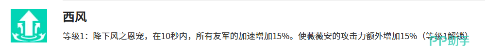 西风算是薇薇安的团队增益技能了。释放之后10秒内全队加速提升15%,薇薇安自己还能额外获得15%攻击力。41级变成17.5%双加成,141级直接拉到20%,而且薇薇安自己还多获得10%加速。这个技能在团战或者打副本的时候作用特别明显,开团之前先放一个西风,整个队伍的机动性和输出能力都会有质的飞跃。