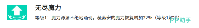 无尽魔力是薇薇安的被动技能,基础就提供22%魔力恢复,61级涨到26%,161级更是达到30%。有了这个被动,薇薇安释放技能的频率会高出不少,基本不用太担心魔力不够用的问题。配合其他恢复装备的话,几乎可以做到无限放技能。